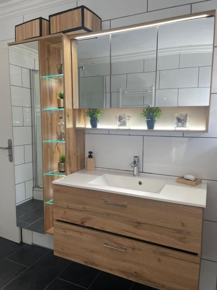 Komplett zu verkaufen wegen Umzug eine Schublade bisschen das Holz leicht abgesplittert aber stört nicht weiter nur komplett zu verkaufen und Selbstabholer und Abholung Vitrine ist 160|55 Waschbecken ist 1meterbreit Spiegel ist 1meter/53 hoch