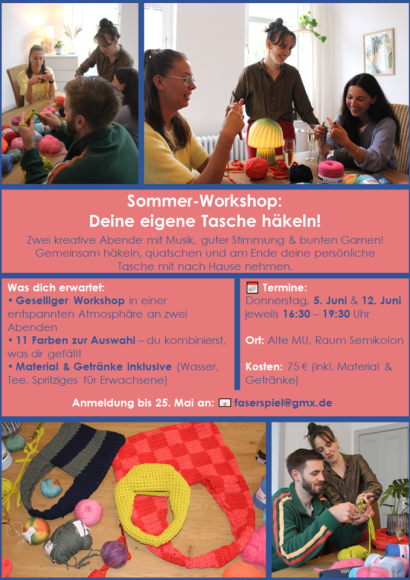 Zwei kreative Abende mit Musik, guter Stimmung & bunten Garnen!Gemeinsam häkeln, quatschen und am Ende deine persönliche Tasche mit nach Hause nehmen.