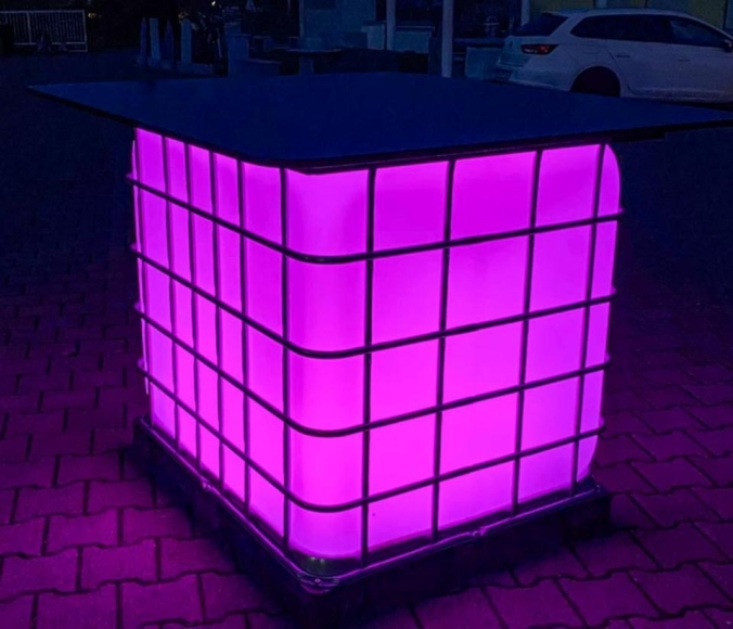 Nicht nur praktisch, sondern auch stylisch. Die beleuchteten IBC Container Stehtische sind ein Blickfang auf Poltertabenden, Geburtstagen, Events, Hochzeiten, Partys, Messen usw.
