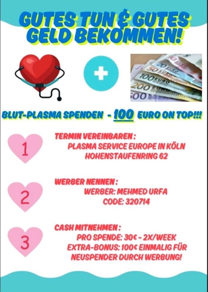 zur Blutplasmaspende bei "Plasma Service Europe" in Köln (Hohenstaufenring 62) aus und nenn beim ersten Termin meinen Namen: