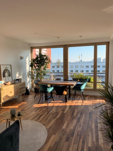 Große Fenster mit viel Licht, toller Blick auf Fernsehturm. Bequemes ruhiges Schlafzimmer mit Doppelbett. Wohnzimmer mit großem Sofa, kleine Terrasse mit Blick, Badewanna, Waschmaschine mit Trocknerfunktion, voll möbliert mit Küchenutensilien und Bettwäsche, schnelles Internet.