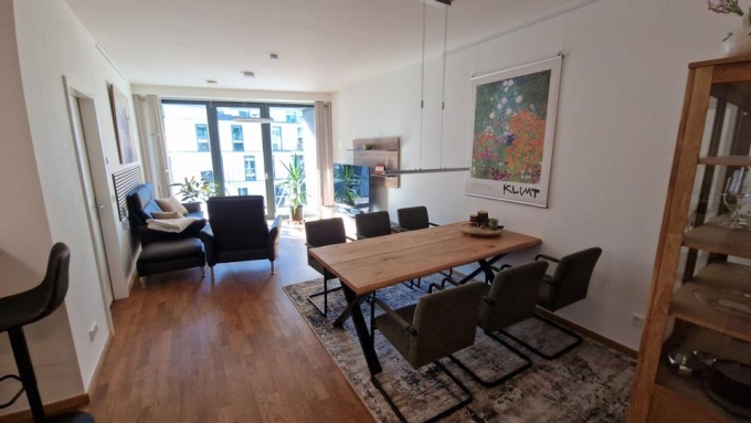 Wir vermieten unsere attraktive, moderne 2-Zimmerwohnung auf Zeit, d. h. befristet. Sie bietet Ihnen das Wohnen in einem Appartement mit Loft-Charakter mitten im beliebten Stadtbezirk Friedrichshain. Das 3. Obergeschoss eines Mehrfamilienhauses erreichen Sie über den Innenhof. Optional gelangen Sie von der Tiefgarage aus mit dem Fahrstuhl direkt zu Ihrer Wohnungstür. Die voll möblierte, energieeffiziente und voll ausgestattete Wohnung wird über Fußbodenheizung mit Fernwärme beheizt. Eine Lüftungsanlage garantiert kontinuierlich Frischluft. Der mit Holz beplankte Balkon ist durch große raumhohe Fenster sowohl vom Wohnzimmer als auch vom Schlafzimmer aus begehbar. Während im Bad natürlicher Buntschiefer verlegt ist, verfügen alle anderen Räume über Echtholz-Parkettfußboden aus Eiche.