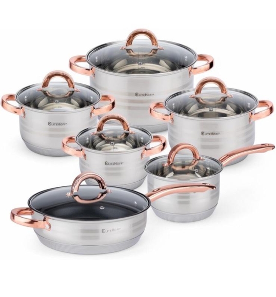 Topfset Induktion, Kochtopf Set mit Glasdeckel, 7-lagiger Edelstahl Topf- & Pfannensets mit Deckel, Griffe in Roségold, Kochgeschirr Set für alle Herdarten (12-teil