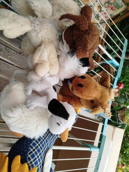Zwei Elche, zwei Hunde, zwei Gänse, ein Hase.
