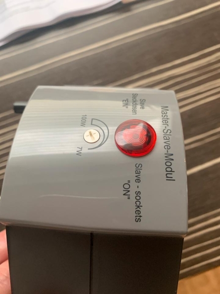 Durch Ein-/ Ausschalten der Master-Steckdose (rot) werden die Slave -Steckdosen (schwarz) und die Steckdosen der in den darüber gesteckten Module automatisch geschaltet
