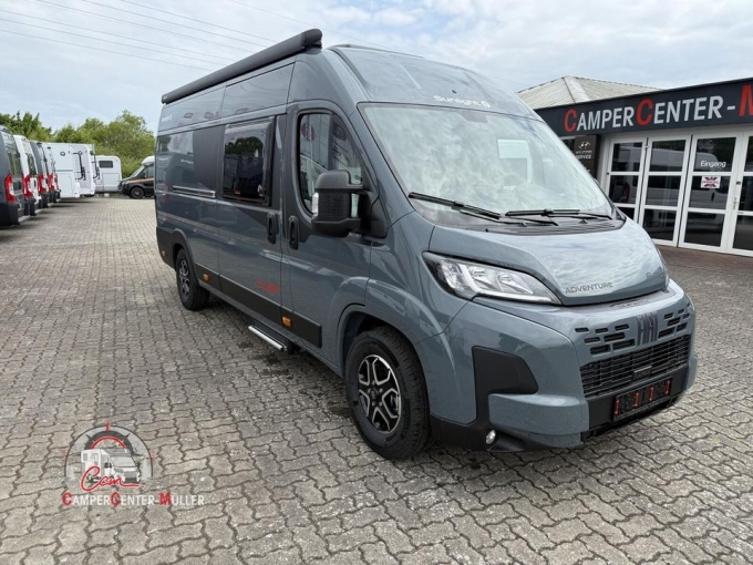 - Editionsausstattung Adventure 640 (Fiat Ducato 3.500 kg | 2.2 Multijet | 103 kW | 140 PS Euro 6 | 6-Gang-Schaltgetriebe, Fiat Weiß, Adventure Beklebung, Wohnwelt Adventure, Markise (schwarz), Panoramadachhaube 70 x 50 cm, Duschausstattung (Brausekopf ausziehbar, Duschvorhang, Führungsschiene, Brausehalter), Fenster im Bad, Kleiderstange in der Nasszelle, Breite Einstiegsstufe, Drehplatte für Tischerweiterung an der Sitzgruppe, Stoßfänger lackiert, Skid Plate Schwarz, Nebelscheinwerfer, Lenkrad & Schaltknauf in Lederausführung, Luftauslässe mit Applikationen Silber (Techno-Trim), 16" Alufelgen Bi-Color)