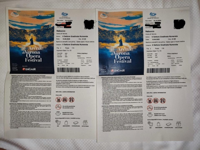 habe für den Opern Saison Start in der Arena in Verona am 13.6. um 21 Uhr 30 noch 2 Karten für Nabucco.