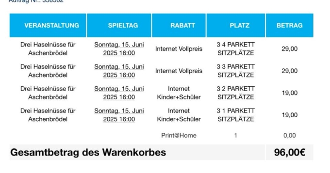 Wir verkaufen 4 Tickets für Drei Haselnüsse für Aschenbrödel Musical am 15.06.25 um 16 Uhr in Moritzburg.