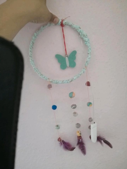 Traumfänger mit selbstgebastelte Perlen und Federn in der Mitte mit Schmetterlinge und eine Lichterkette mit warmweiß Licht.