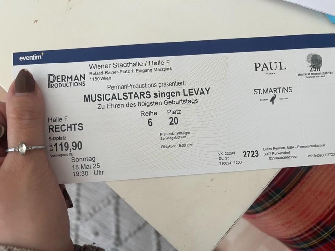 Hey! Da ich leider eine Terminüberschneidung habe würde ich gerne meine Karte für Musicalstars singen Levay am 18.05.25 in Wien abgeben. Beginn ist 18:30 Uhr. Der Platz ist in Reihe 6. Meldet euch gerne bei Interesse.