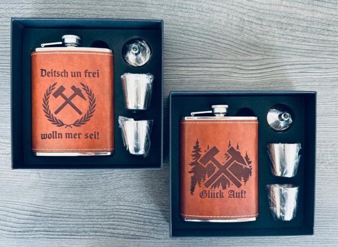 Exklusives Flachmann-Geschenkset mit Gravur – Bergbau-Design – 20 € pro Set