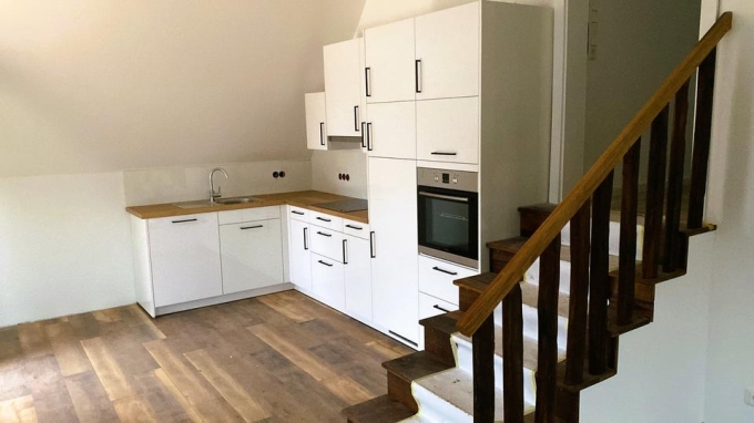 Die Ausstattung der Wohnung ist komfortabel, incl. Einbauküche und Fußbodenheizung in allen Räumen. Neben der hellen Gestaltung sorgt das zum Teil sichtbare Holzfachwerk für wohnliches Ambiente. Das 3. Zimmer und ein zusätzlicher kleiner Raum befinden sich im ausgebauten Dachboden zur Nutzung als Kinder-/Gästezimmer oder auch als Büro für Homeofficetätigkeiten.