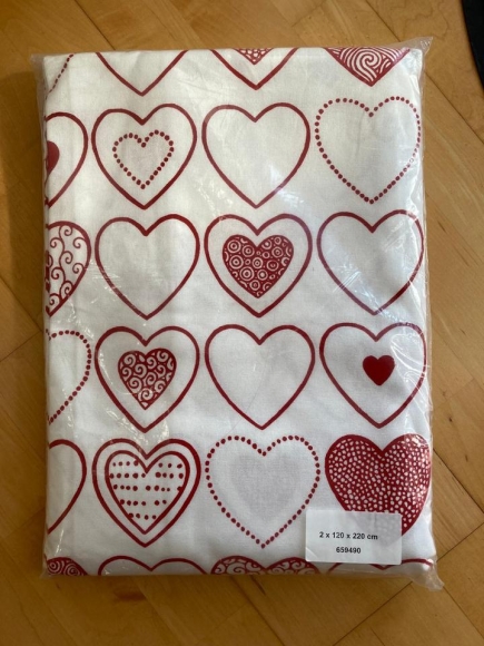 Weiß mit roten Herzen in verschiedenen Formen bedruckt.