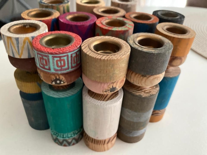 Die Kerzenständer aus Holz, ca. 9 cm hoch, wurden bemalt. Kann sicher übermalt werden.