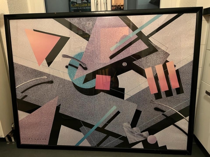 Clint Eagar (*1958) hat mit seinen expressiven und verspielten abstrakten Kompositionen den wilden Geist der 80er eingefangen wie kaum ein Zweiter und war eine prägende Figur des contemporary design im späten 20sten Jahrhundert. Dieser seltene “Front Line Edition” Druck von 1988 ist zu einem begehrten Sammlerobjekt geworden und wird auf Plattformen wie eBay und Etsy für ca. 200€ gehandelt. Er befindet sich im unrestaurierten Originalrahmen, und verströmt so noch mehr authentischen Retro-Charme. Mit beeindruckenden Maßen von 128 x 98 cm ist dieses ikonische Bild ideal als Blickfang für Wohnzimmer, stylishe Lofts oder trendige Cafés. Ursprünglich wurde es für 899 Deutsche Mark verkauft und ist heute eine seltene Gelegenheit, ein echtes Stück amerikanischer Designkultur der 1980er Jahre zu besitzen. Selbstabholung in 10115 Berlin Mitte.