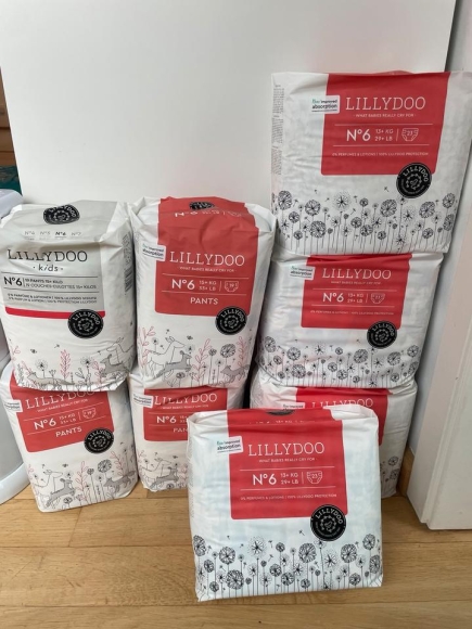 8 ungeöffnete Packungen Lillydoo Windeln, alle Größe 6 (168 Windeln), 4 Packungen mit Tabs und 4 Packungen Pull-Ups. 40 €.