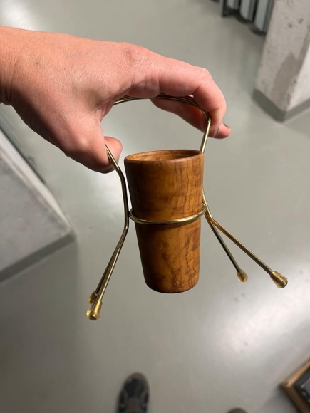 Der Becher ist aus schön gemasertem Holz gefertigt (vermutlich Olivenholz oder ähnliches Hartholz) und sitzt perfekt in dem filigranen Messinggestell. Der Halter zeichnet sich durch seine typischen ausgestellten Beine und die Kugelfüße im beliebten "Atomic" oder "Sputnik"-Stil aus.
