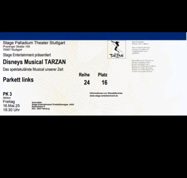 2 Karten (Erwachsen, nebeneinander) für das Musical Tarzan in Stuttgart am Freitag, 16.05.2025 zu verkaufen für 130€