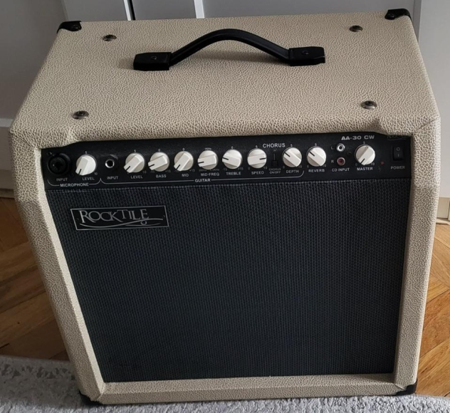 Klangvoller, cremefarbener, 30 Watt-Verstärker für Gesang und evtl. Gitarre. Mikrofoneingang. Auch externe Geräte können abgespielt werden.