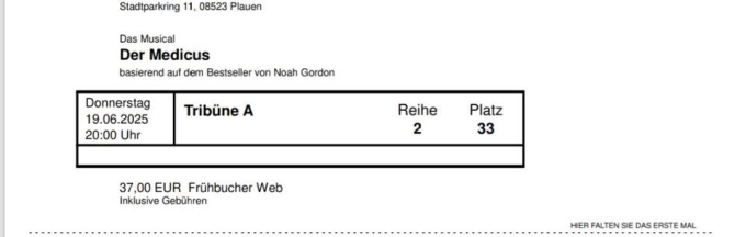 Verkaufe zwei Tickets für den Medicus in Plauen am 19.06 um 20 Uhr.