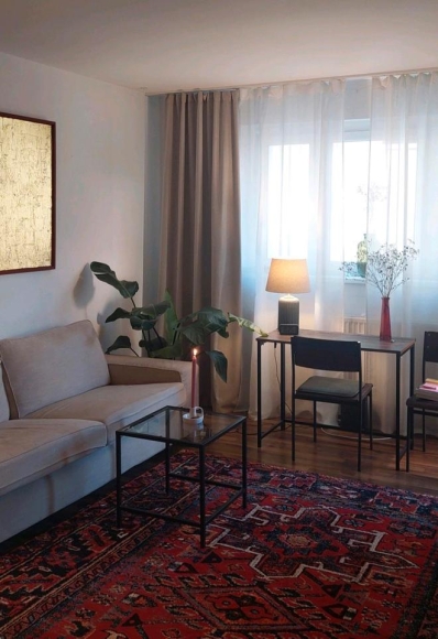 The flat has a cosy vibe with a bit of oriental spirit. Rather minimalistic but with all essentials you need (kitchen equipment, washing machine, cleaning tools, towels, bedding), good wifi and a small empty closet for your clothes & things.
