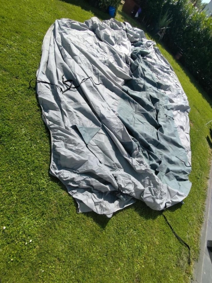 verkaufe eine Abdeckplane für einen Wohnwagen. Größe XL. Maße bitte dem Foto entnehmen.