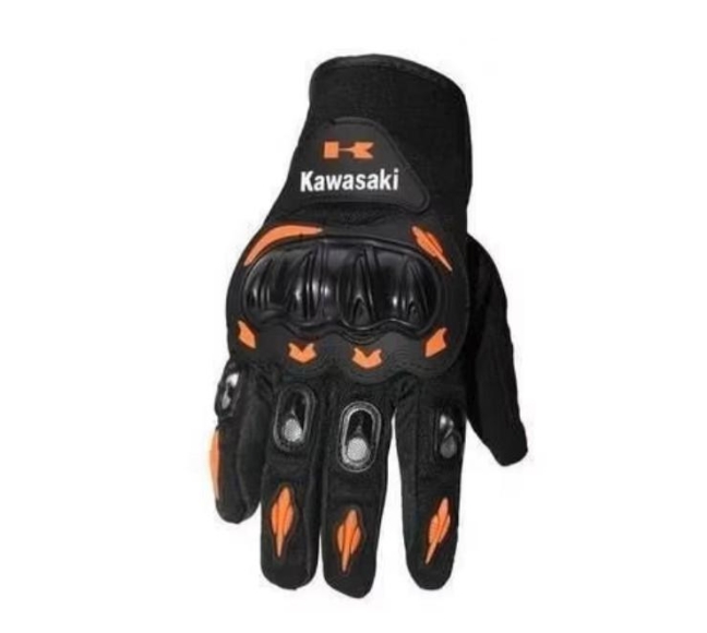 Motorrad Handschuhe in Orange mit Kawasaki Schriftzug.