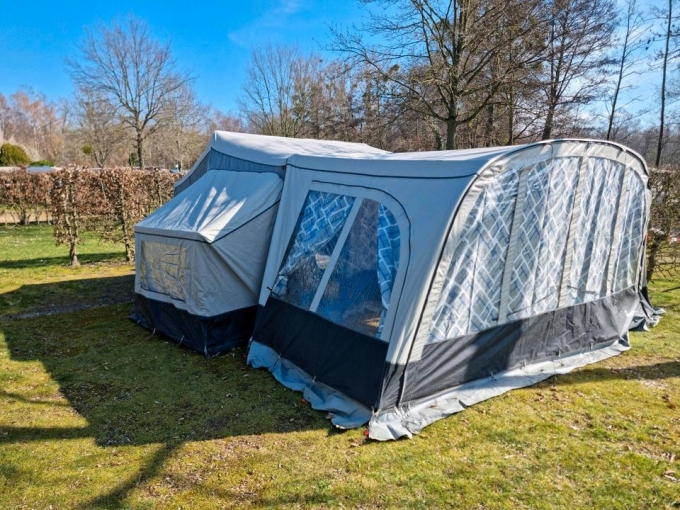 Er ist mit einer zusätzlichen Schlafkabine ausgestattet und ein großes Vorzelt ist dabei.