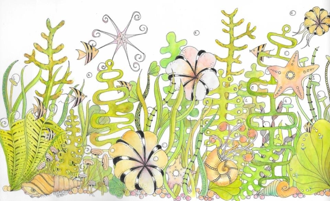 Meereselementen auf einem länglichen Blatt, das Du gut zum Leporello falten kannst. Mit sanfter Farbgebung lernst du diese Art von leichtfließender Kunst.