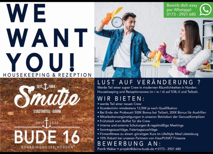 Für unser 3 Sterne-Superior Stadthotel- Smutje und unser modernes Boardinghouse BUDE16 suchen wir Hausmeister-Mitarbeiter (Schwerpunkt kleinere Renovierungs-und Ausbesserungs- Maler-Arbeiten von Hotelzimmern und Appartements) auf 556,-€ Basis ab sofort oder nach Vereinbarung.