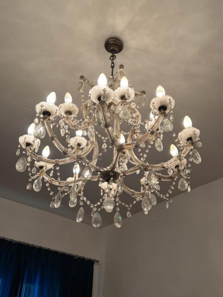 Der Kronleuchter ist aus Glas , 15flammig. Vor Jahren in einem Düsseldorfer Antiquitätengeschäft erworben. Ist etwas verstaubt, müsste abgenommen werden. Nur an Selbstabholer.