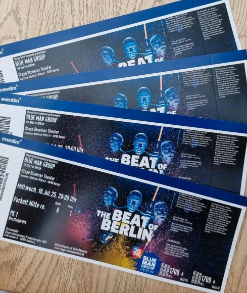 Zum Verkauf stehen 4 Tickets für die Blue Man Group (The Beat of Berlin). Uns ist etwas dazwischengekommen, für das die Ticketversicherung leider nicht gilt: