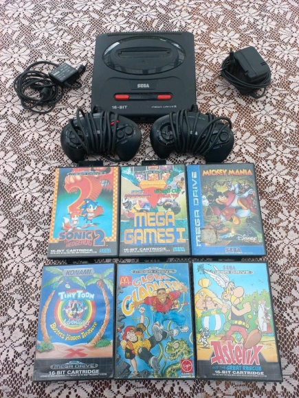 Sega Mega Drive 2 Konsole mit Controllern spielen und Zubehör