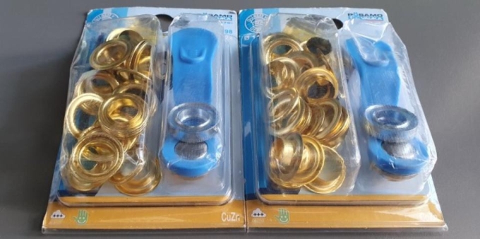 Ich lege noch ein drittes Päckchen kostenlos dazu von kleineren Ösen . Das Durchmesser ist nicht lesbar.