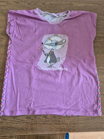 Selbstgenähtes Shirt in Gr. 122. Leider mit Flecken. Fallen, dank dem bunten Rückstoff, aber nicht so auf.