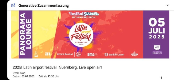 Hallo ich verkaufe zwei Tickets für das Latin Festival am Nürnberger Flughafen. Wer Spaß an Latin Amerikanische Musik steht wird das Festival lieben.