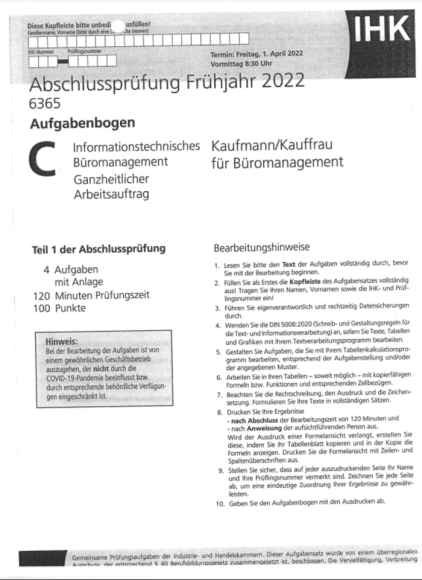 Ich verkaufe eine Original Abschlussprüfung Teil 1 für den Ausbildungsberuf Kauffrau/Kaufmann für Büromanagement. Die Prüfung ist von Frühjahr 2022, Version C.