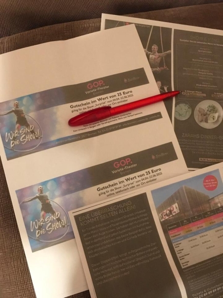 Die Gutscheine haben jeweils einen Wert von 25,-€ und sind für die Show Surprise, also noch bis 22.06.25 einlösbar.