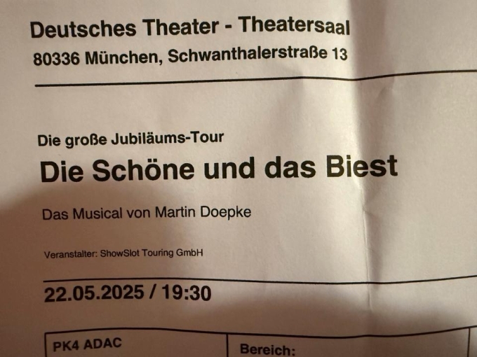 2 Tickets „die Schöne und das Biest“ München 22.5.25