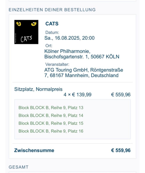 Verkaufe 4 Tickets für CATS am 16.08. in Köln. Preiskategorie 1