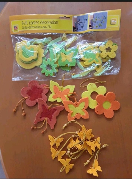 Die Filzdekorationen sind in den Farben gelb , hell grün und intensiv ! orange .