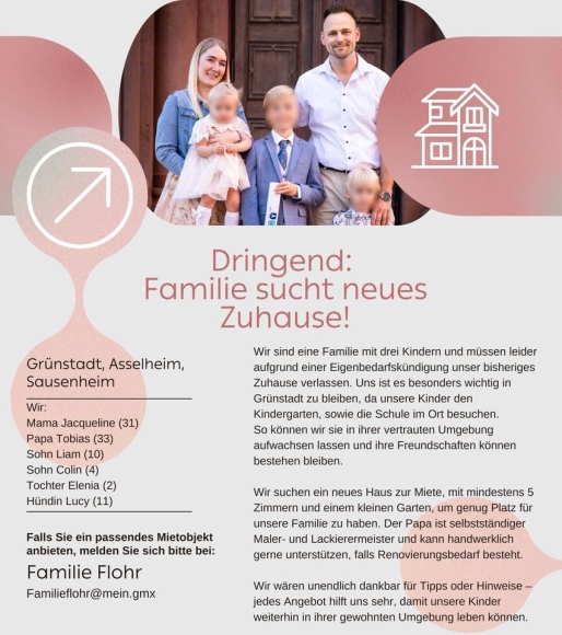 wir sind weiterhin dringend auf der Suche nach einem neuen Zuhause für unsere 5-köpfige Familie, und die Zeit drängt wirklich. Der angespannte Wohnungsmarkt macht es uns unglaublich schwer, und langsam wissen wir nicht mehr weiter.