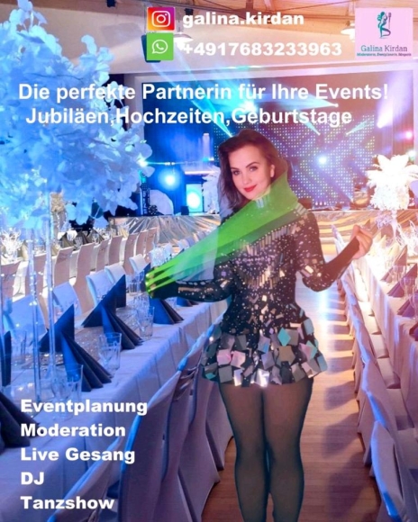 Ich bite Eventplanug, Moderation, Gesang live (Cover) und DJ Musik, Show - Performance mit Kostümen. Www.event-galina.de