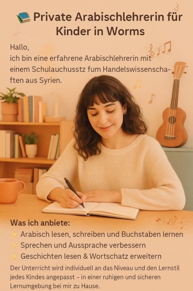 ich bin eine erfahrene Arabischlehrerin mit einem Schulabschluss in Handelswissenschaften aus Syrien. Mit viel Geduld und Liebe zum Detail unterrichte ich Kinder in verschiedenen Altersstufen – mit spielerischen, kindgerechten Methoden, die Freude am Lernen wecken.