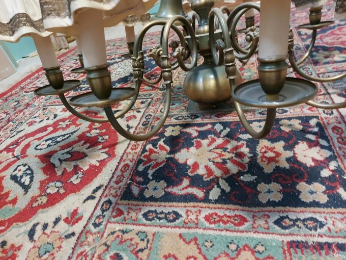 Lampenschirme innen teils anbebrannt und brüchig. Vielleich die wegmachen und durch schöne modere Birnen ersetzen...bestimmt toll anzusehen..War bis vor kurzen im Gebrauch...verschmutzt aber funktionstüchtig... Messing ist entsprechend schwer...