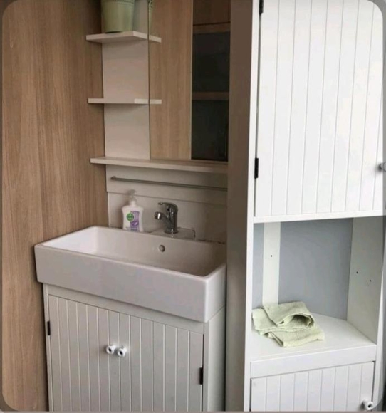 Zum Verkauf steht ein weißes Badezimmerschrank-Set der Marke IKEA.