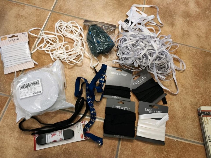 Sammlung an Gummibändern, Schrägbändern in weiß und schwarz und vieles mehr