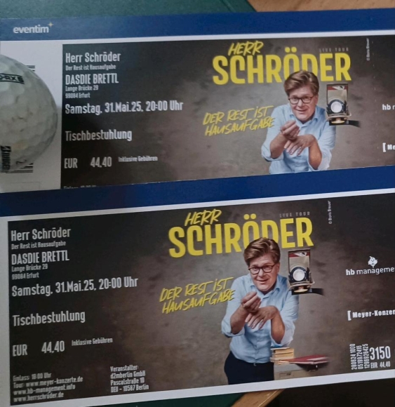 Hallo Freunde,zwei Tickets für ausverkaufte Veranstaltung Herr Schröder in Erfurt abzugeben.