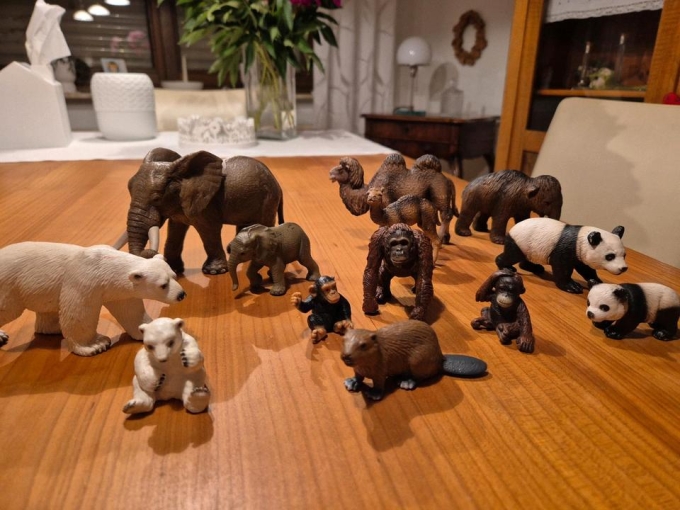Ich verkaufe hier 13 Schleichtiere. 2 Elefanten, 2 Pandabäre, 2 Eisbären, 3 Affen, 2 Kamele,1 Mammut, 1 Biber