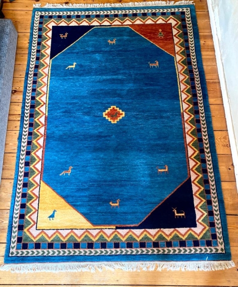This is a beautiful, hand-knotted Gabbeh Persian rug made from 100% wool, measuring 170 x 240 cm (5'7" x 7'10"). Featuring a rich blue central field with playful tribal animal motifs and bold geometric borders, this rug comes from Iran with a shepherd style narrative.